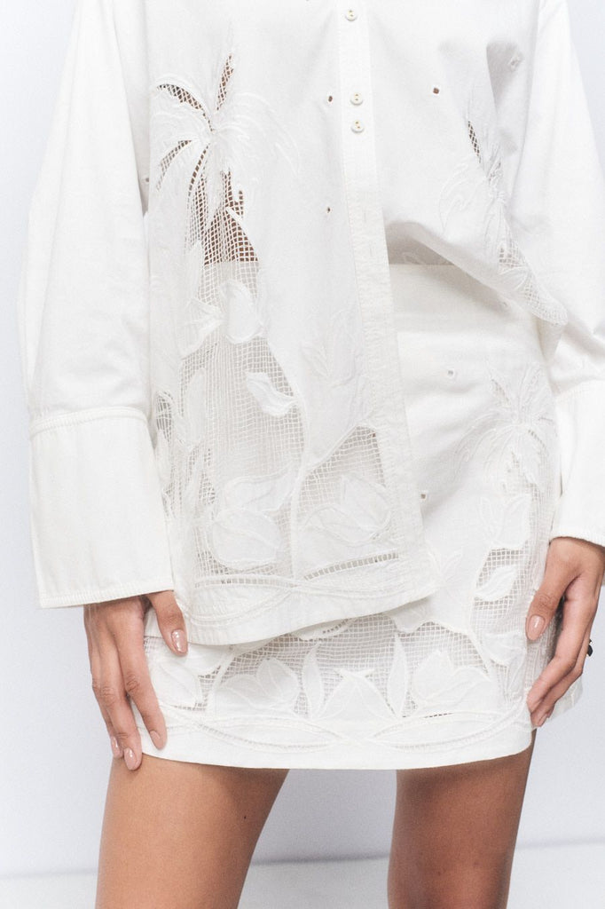 - Placement embroidered botanical motifs
