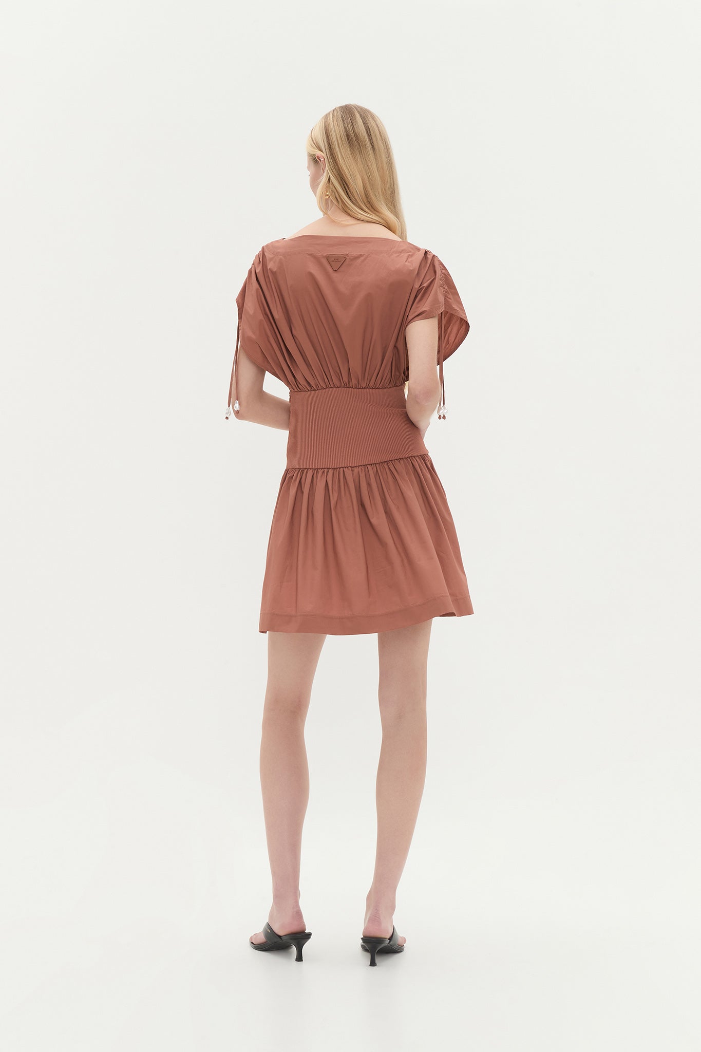- Adjustable shoulder gather detail with pearl bead accent