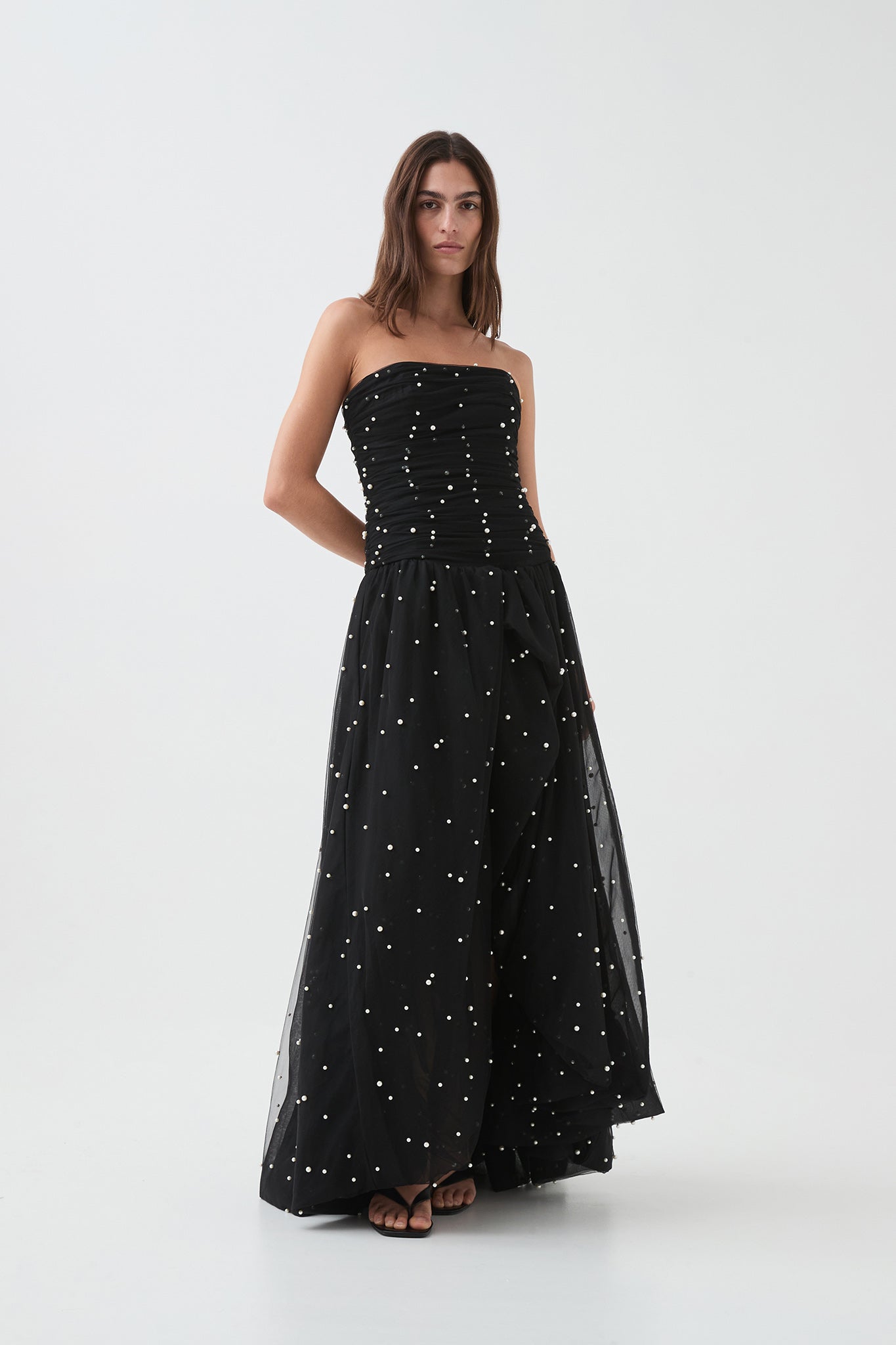- Ruched pearl bead tulle overlay throughout bodice