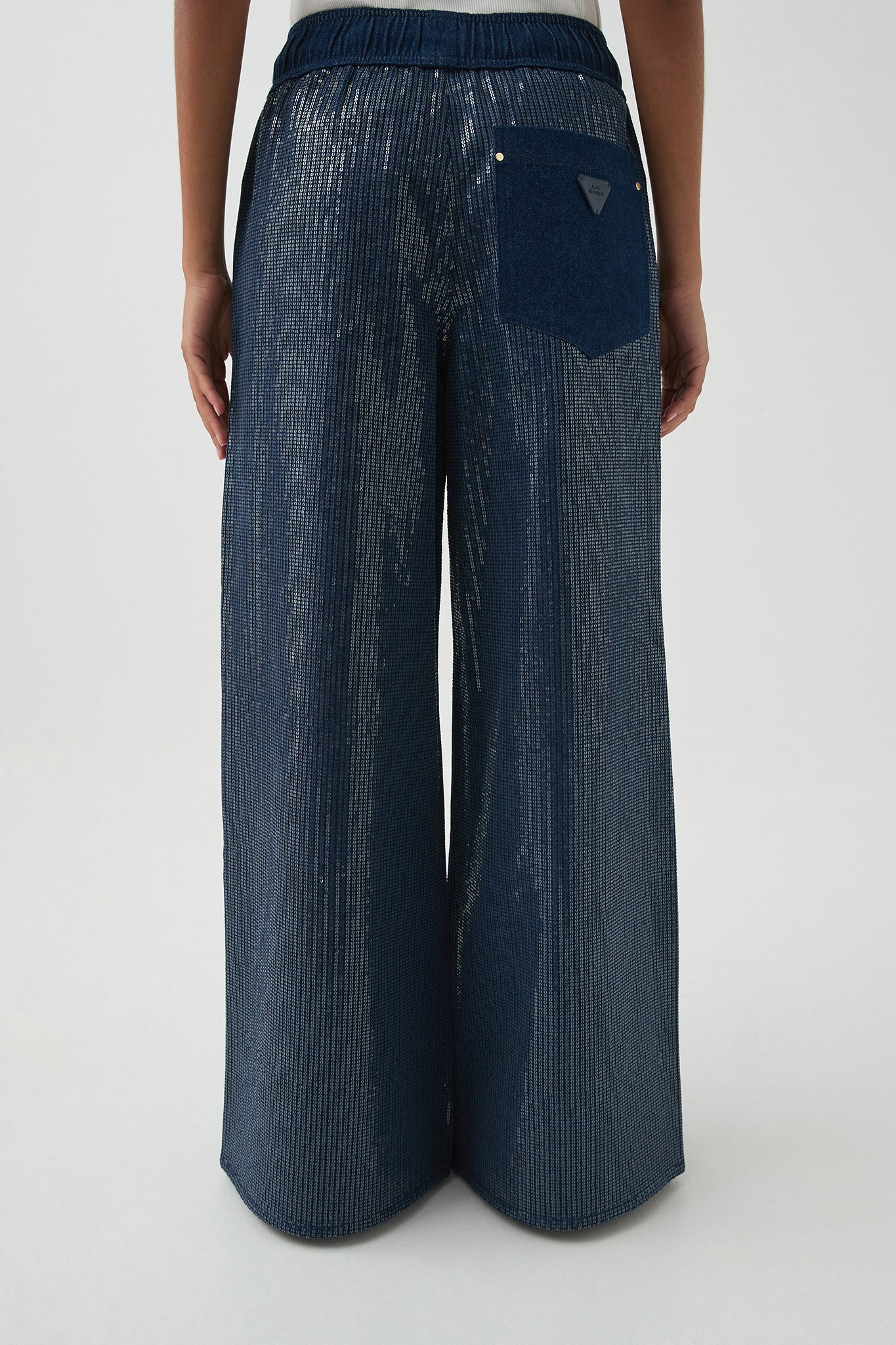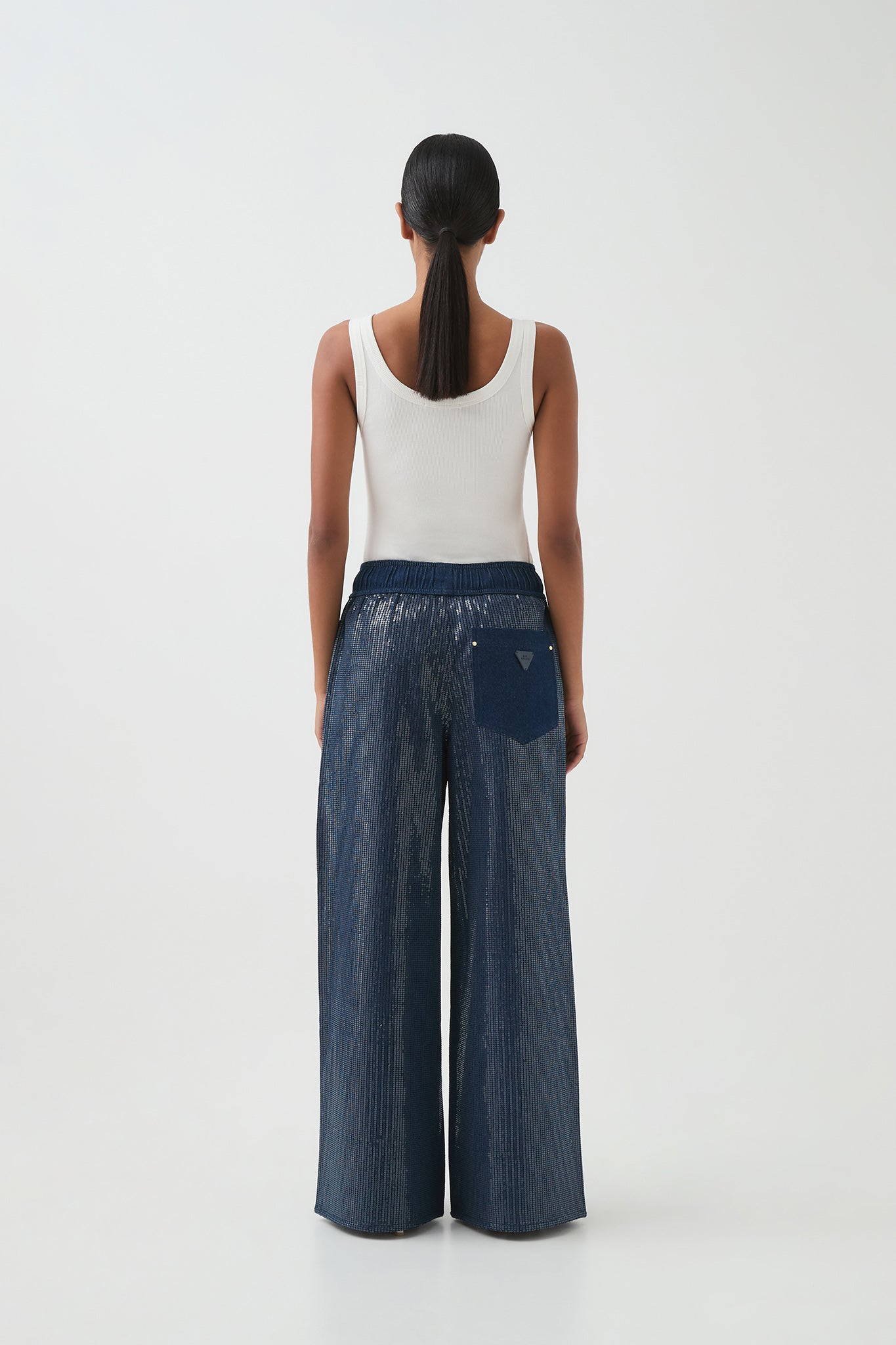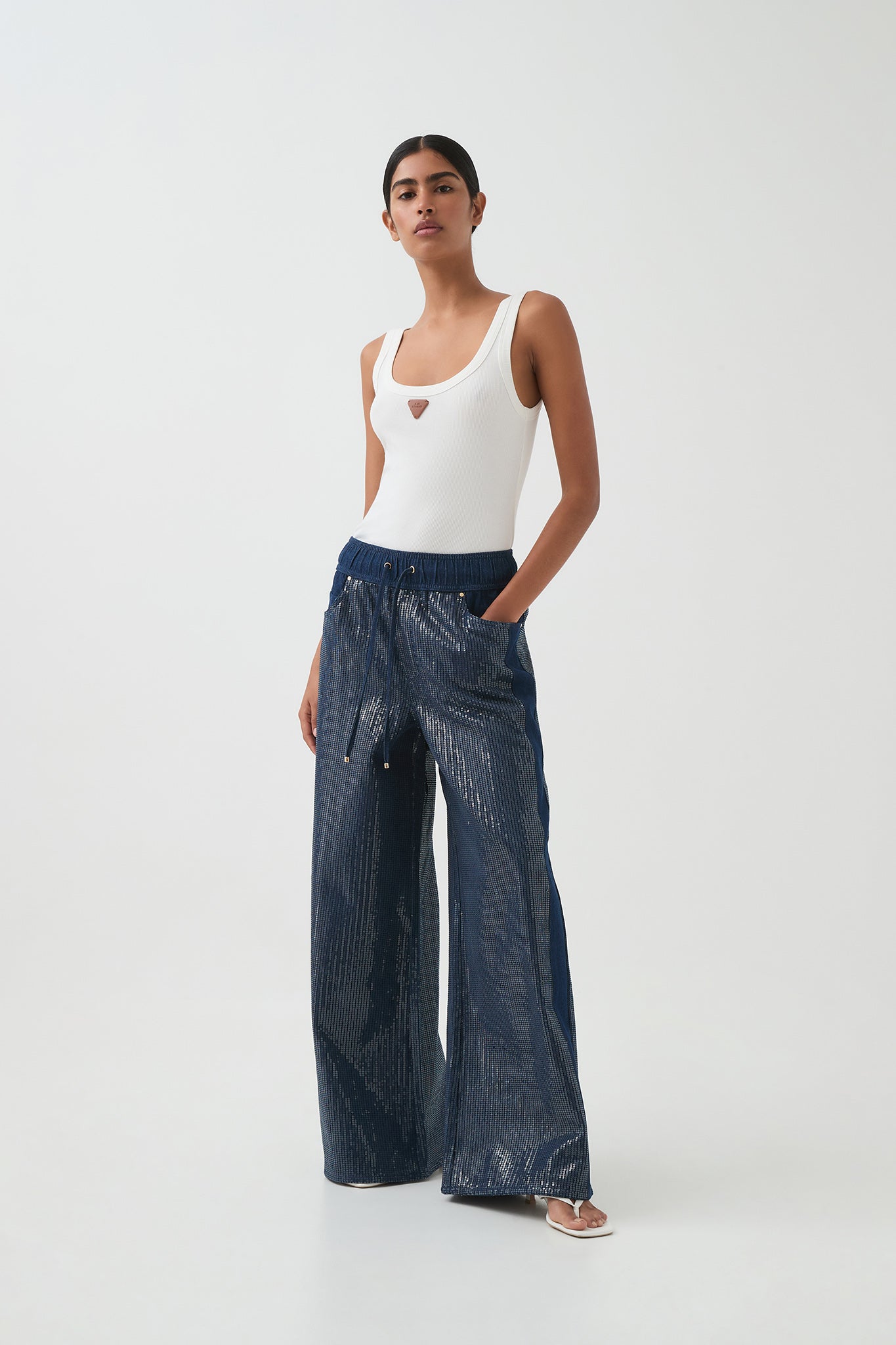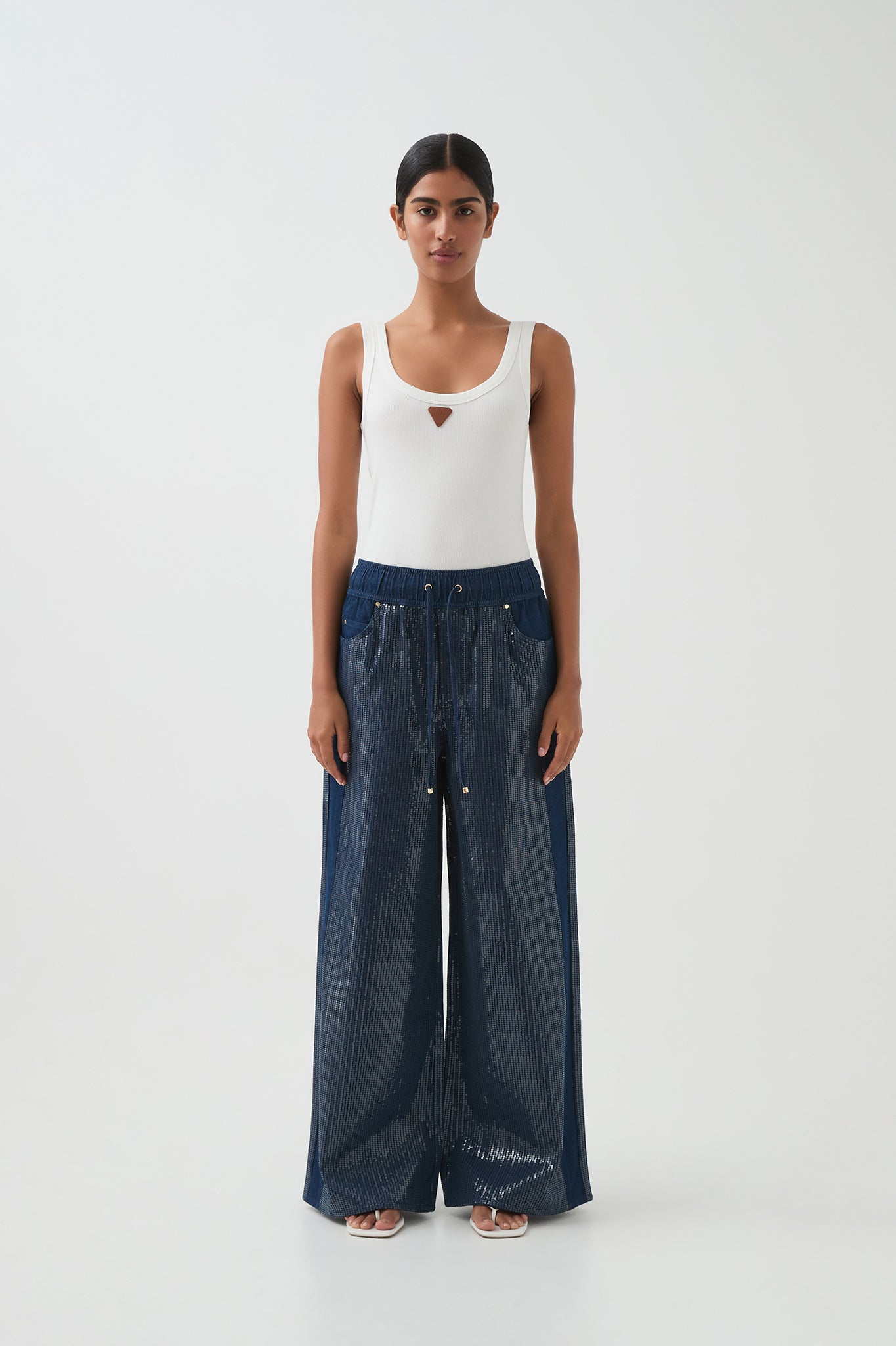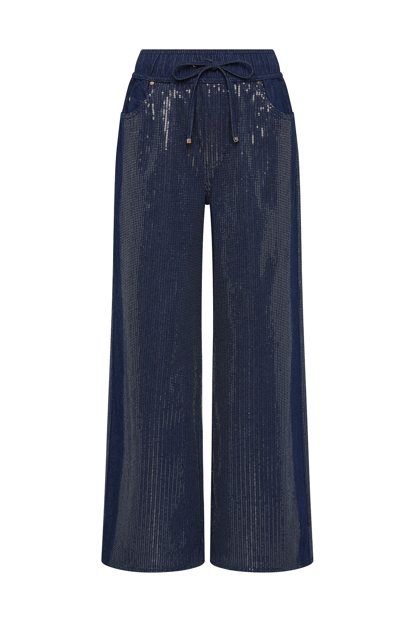 - Wide elasticated waistband with gold tipped drawcords